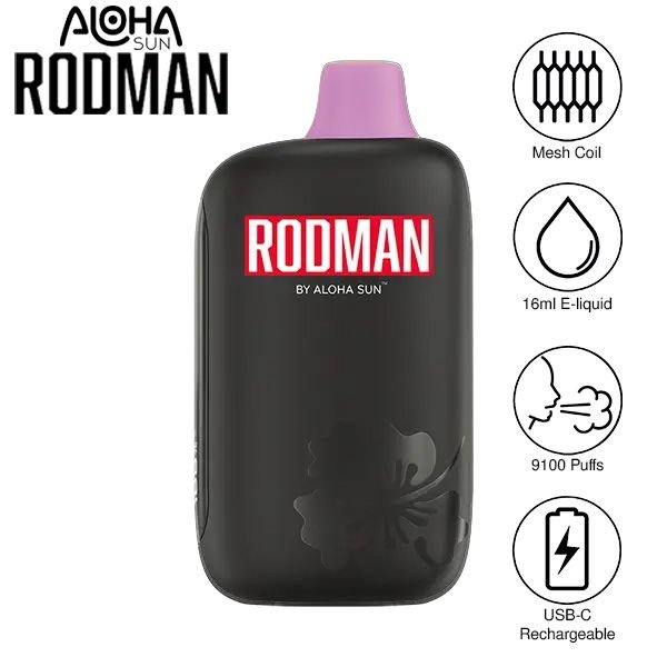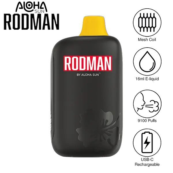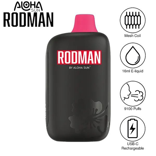 Rebound with the Aloha Sun DENNIS RODMAN 9100 Disposable, prefilled eJuice capacity of a full 16ml, 5% nic strength, and up to 9100 puffs of amazing flavor. Offered in a myriad of flavors with colorful mouthpieces, the Rodman 9100 Disposable is modeled after the legend himself.