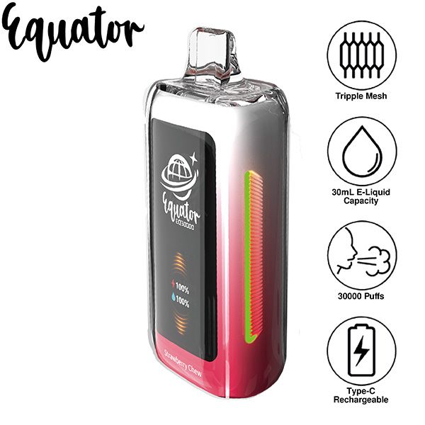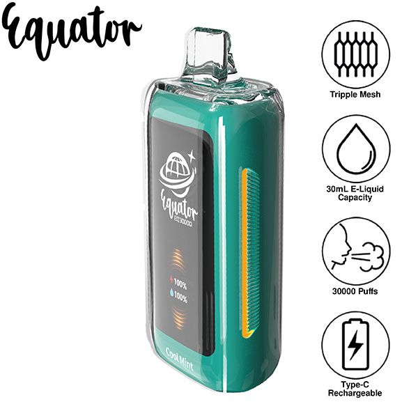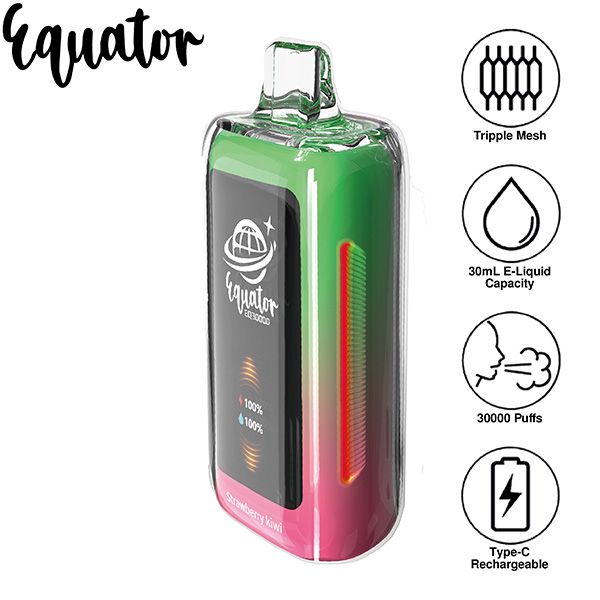 The Equator EQ30000 is a high-capacity disposable device designed for vaping enthusiasts. It boasts an impressive 30,000 puffs and a 5% nicotine salt concentration for a satisfying vape experience. The device features a generous 30 ML e-liquid capacity, divided evenly across triple tanks, each holding 10 ML. This design is complemented by a triple-mesh coil system, ensuring optimal flavor and vapor production. The EQ30000 also includes an animated screen for easy monitoring and a Type-C port for convenient charging.